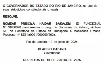 Nesta quinta-feira (10), o governador Cláudio Castro (PL) anunciou quem assumirá a nova pasta estadual de Transportes. O nome escolhido foi o de Priscila Haidar Sakalem. Sua nomeação saiu em edição extraordinária do Diário Oficial.