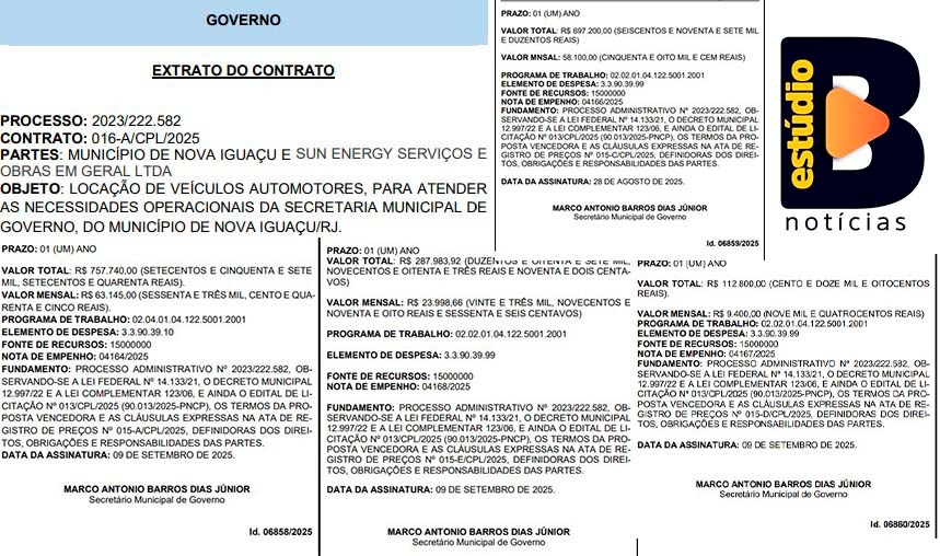Após ter concluído contrato de R$ 9 milhões para a área de tecnologia, a Secretaria de Governo de Nova Iguaçu publicou a locação de 30 veículos com diversas empresas. Uma dessas é a empresa Sun Energy Serviços e Obras em Geral Ltda., que fica em um bairro nobre do Rio de Janeiro, e que teve o maior contrato no valor de R$ 757.740,00 (setecentos e cinquenta e sete mil, setecentos e quarenta reais).