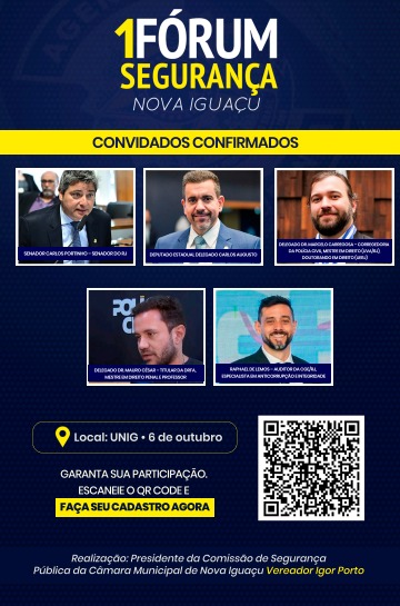 Na próxima segunda-feira (6), às 18h, a UNIG, em Nova Iguaçu, será palco do 1º Fórum de Segurança Pública, promovido pela Comissão de Segurança Pública da Câmara Municipal, presidida pelo vereador Igor Porto.