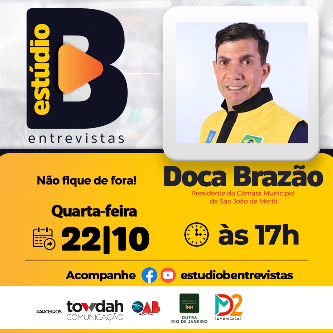 Nesta quarta-feira (22), às 17h, Doca Brazão (MDB), presidente da Câmara de São João de Meriti, será entrevistado no Estúdio B. Doca foi eleito vereador pela primeira vez no ano 2000 e ocupou o cargo até 2008. Em 2016, ele concorreu ao cargo de prefeito de São João de Meriti, ficando em terceiro lugar com 26.830 votos. Doca Brazão foi eleito vereador nas eleições de 2024, recebendo 5.205 votos.