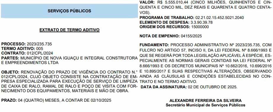 A Prefeitura de Nova Iguaçu, por meio da Secretaria de Serviços Públicos, dará um tratamento VIP aos ralos da cidade. Será? Eis a pergunta que fica no ar. No famoso Diário Oficial da cidade foi publicada a renovação do contrato para serviços de limpeza de ralos da cidade no valor de R$ 5.555.010,44 (cinco milhões, quinhentos e cinquenta e cinco mil, dez reais e quarenta e quatro centavos), por quatro meses.