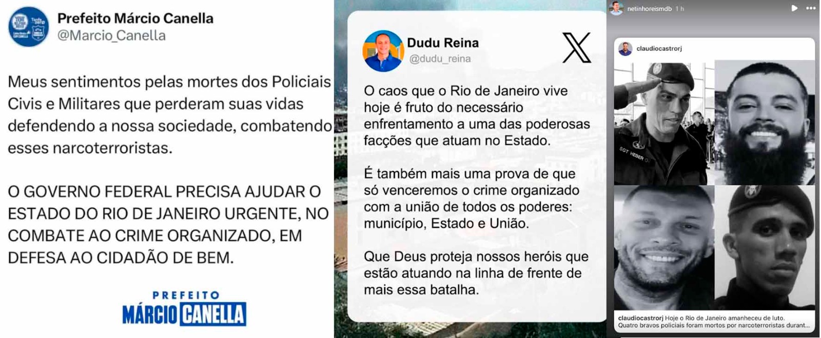 Em Nova Iguaçu, o prefeito Dudu Reina (PP) também se manifestou usando sua rede oficial. Segundo especialistas em segurança pública, o prefeito tirou da reta a responsabilidade do município. “O texto publicado em sua rede social é muito parecido com o que foi publicado na página do ex-prefeito da cidade. Tipo, deu uma satisfação para não passar em branco”, disse o especialista. Parte do trecho dizia: “é também mais uma prova de que só venceremos o crime organizado com a união de todos os poderes: município, Estado e União”.