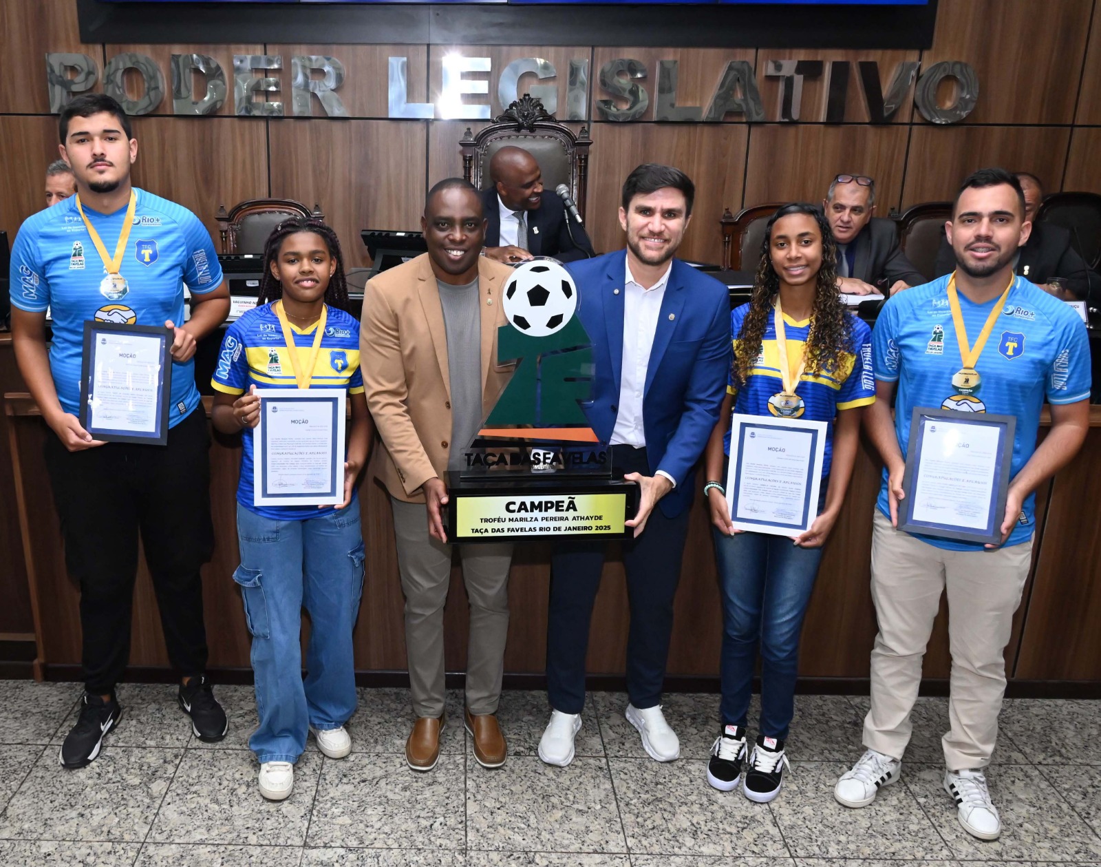 A Câmara Municipal de Nova Iguaçu prestou homenagem ao time feminino da comunidade de Três Campos, Tradição Futebol Clube, que ganhou o título da Taça das Favelas 2025 na categoria feminina. Durante a sessão ordinária de hoje, 5 de outubro, atletas e comissão técnica foram agraciados com Moções de Aplauso e Congratulação, proposta pelo vereador Claudinho da Kombi.