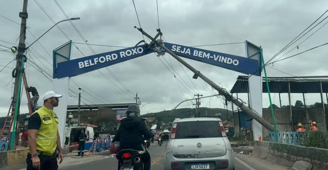 Um abençoado motorista de caminhão bateu no poste da Light que fica próximo ao novo pórtico na divisa de Belford Roxo e São João de Meriti, na altura do bairro Jardim Glaucia. Na queda, o poste acertou em cheio o coitado do pórtico que tinha menos de 24 horas de inaugurado.