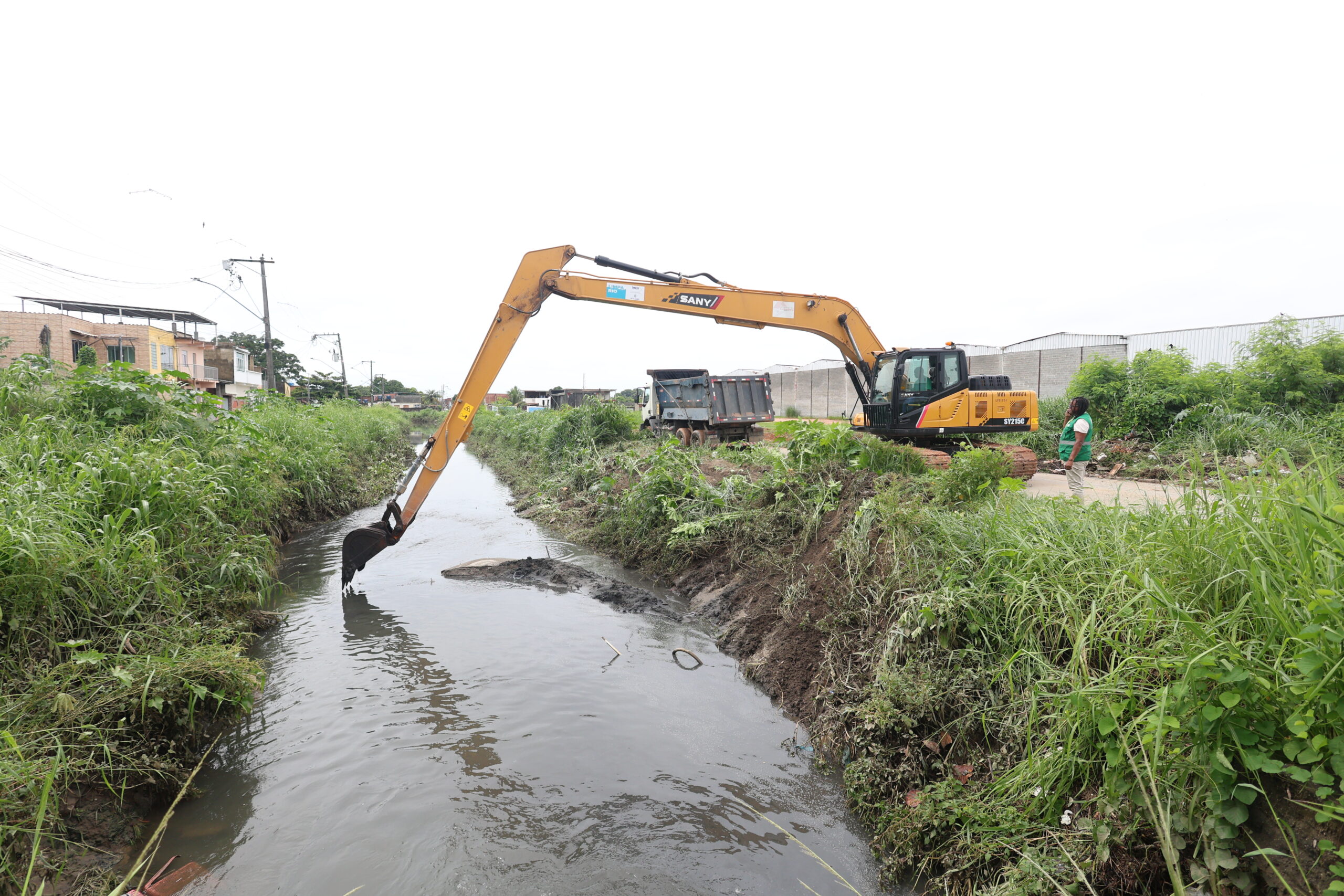 No total, quatro escavadeiras e oito caminhões operam no Canal São Bento, Canal Faria, Canal Marilândia e Valão da 7 para garantir a liberação de vias.